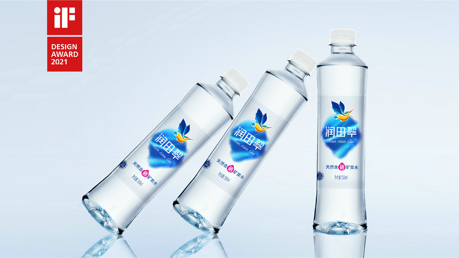 Based on the golden symbol "Kingfisher with Golden Belly", the packaging has been completely upgraded, subverting the traditional round-shouldered bottle shape. The creatively designed exclusive bottle shape for Runtian Cui: the "Straight-Shouldered Crystal Bottle" has greatly improved the product added value. The water drop pattern on the bottle label originates from the traditional Chinese ink wash elements. Cat's eye laser effect is used in the image to create a series of colored lights, just like the rippling water light in nature. The bonding part of the bottle label adopts laser anti-counterfeiting technology, which is an original creation in the water industry. This work has won the iF Design Award.